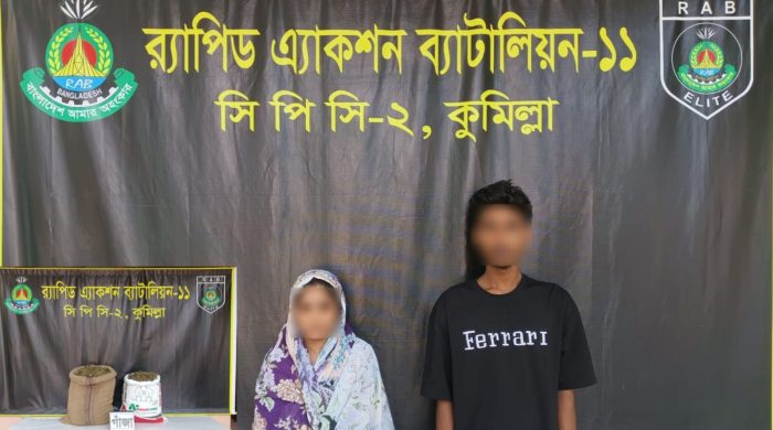 কুমিল্লা প্রতিনিধি : কুমিল্লার বুড়িচংয়ে র‌্যাপিড এ্যাকশন ব্যাটালিয়ন (র‌্যাব)-১১, সিপিসি-২ এর এক বিশেষ অভিযানে ২০ কেজি গাঁজাসহ দুই মাদক ব্যবসায়ীকে গ্রেফতার করা হয়েছে। গ্রেফতারকৃতরা সম্পর্কে মা ও ছেলে। র‌্যাব জানায়,
