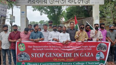 দুমকি প্রতিনিধি : গাজায় সাধারণ জনসাধারণের উপর ইসরায়েলি আগ্রাসনের প্রতিবাদে জাতীয়তাবাদী ছাত্রদলের কেন্দ্রীয় কর্মসূচি “স্টপ জেনোসাইড ইন গাজা’র অংশ হিসাবে পটুয়াখালীর দুমকিতে জনতা ডিগ্রী কলেজ শাখার উদ্যোগে এক মানববন্ধন ও