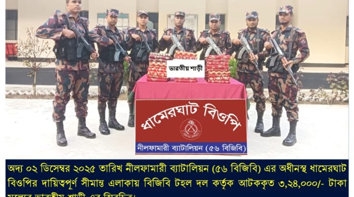 এম আই আকাশ, বোদা,পঞ্চগড় : পঞ্চগড়ের ধামেরঘাট বিওপি সীমান্তে চোরাচালানবিরোধী অভিযানে ৩ লাখ ২৪ হাজার টাকা মূল্যমান ভারতীয় শাড়ী আটক করেছে বর্ডার গার্ড বাংলাদেশ (৫৬ বিজিবি)। সোমবার ২ ডিসেম্বর দিবাগত