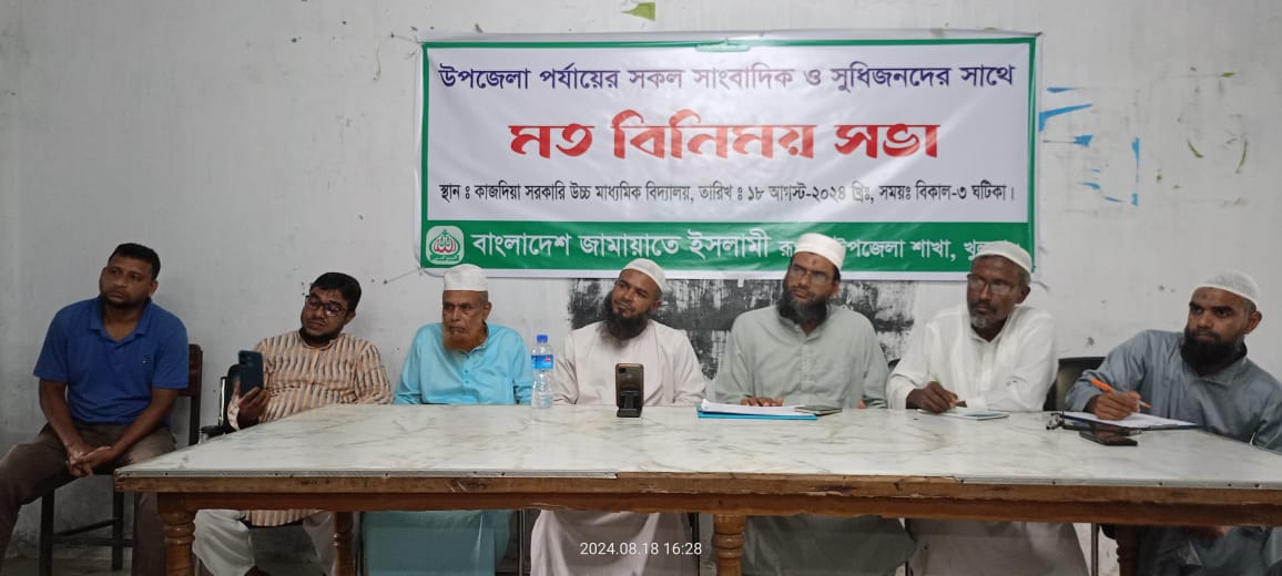 রুপসা প্রতিনিধি : বাংলাদেশ জামায়াতে ইসলামী রূপসা উপজেলা শাখার আয়োজনে উপজেলা পর্যায়ে সকল সাংবাদিক ও সুধিজনদের সাথে মতবিনিময় সভা করে। রবিবার বিকেল ৩ টায় কাজদিয়া সরকারি উচ্চ মাধ্যমিক বিদ্যালয়ের অডিটোরিয়ামে অনুষ্ঠিত এ সভা হয়।
