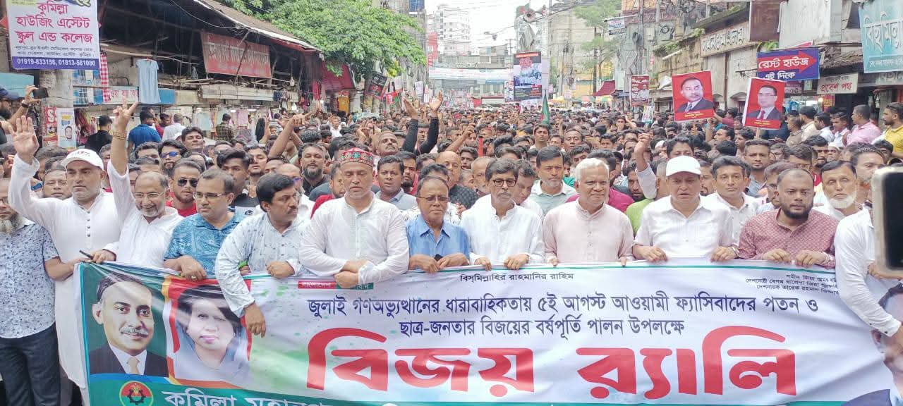 মোঃ ইয়াছিন মিয়া, কুমিল্লা প্রতিনিধি : জুলাই মাসের গণঅভ্যুত্থানের ধারাবাহিকতায় ৫ আগস্ট আওয়ামী ফ্যাসিবাদের পতন ও ছাত্র-জনতার বিজয়ের বর্ষপূর্তি উপলক্ষে আজ বৃহস্পতিবার ৬ আগস্ট দুপুর ১২টায় কুমিল্লা মহানগর, দক্ষিণ জেলা ও উত্তর জেলা বিএনপির যৌথ আয়োজনে একটি বিজয় র্যালি ও সমাবেশ অনুষ্ঠিত হয়েছে।