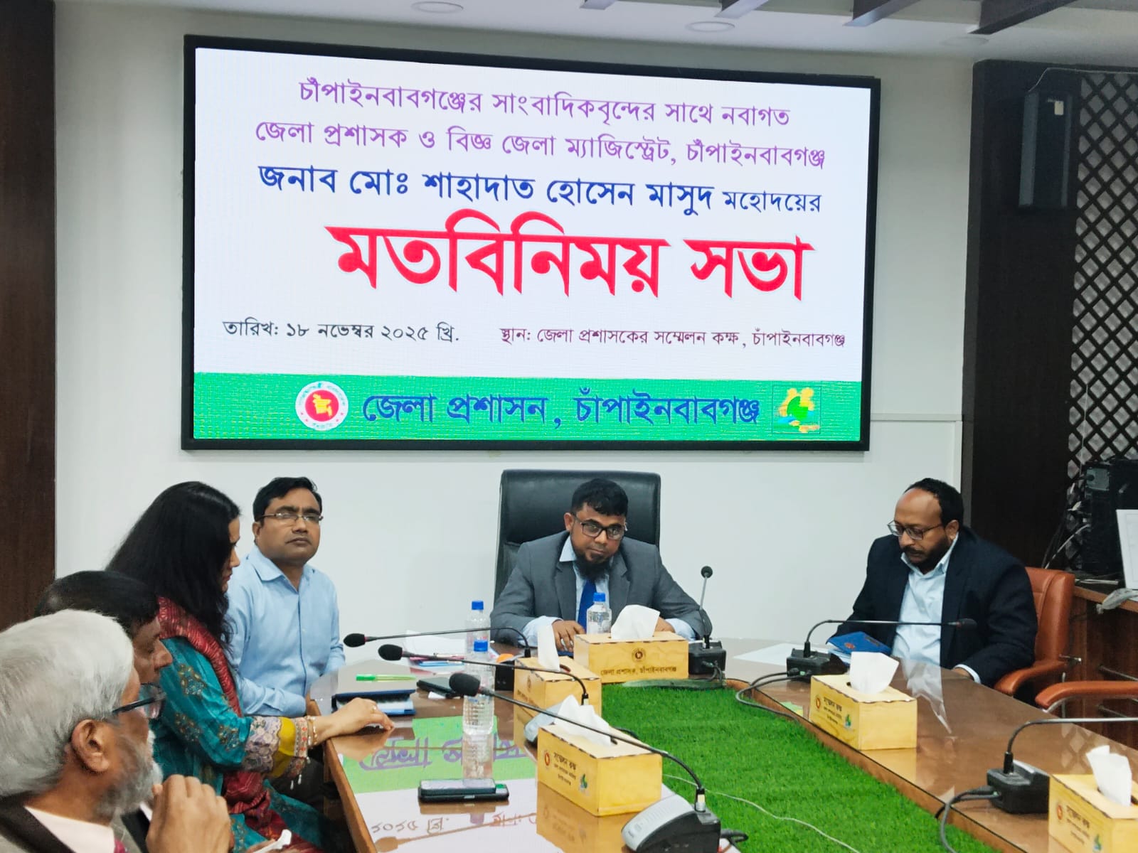 চাঁপাইনবাবগঞ্জ জেলা প্রতিনিধি : চাঁপাইনবাবগঞ্জে সাংবাদিকদের সাথে নবাগত জেলা প্রশাসকের মতবিনিময় সভা অনুষ্ঠিত হয়। চাঁপাইনবাবগঞ্জের নবাগত জেলা প্রসাশক ও বিজ্ঞ জেলা ম্যাজিস্ট্রেট বৃহস্পতিবার ১৮ নভেম্বর বিকেল ৪ টায় জেলা প্রশাসক কার্যালয়ের সম্মেলনকক্ষে এ মতবিনিময় সভা অনুষ্ঠিত হয়। উক্ত মতবিনিময় সভার শুরুতেই বক্তব্য রাখেন নবাগত জেলা প্রশাসক মো. শাহাদাত হোসেন মাসুদ। এছাড়াও মতবিনিময় সভায় বক্তব্য রাখেন চাঁপাইনবাবগঞ্জ প্রেসক্লাবের সভাপতি গোলাম মোস্তফা মন্টু, চাঁপাইনবাবগঞ্জ জেলা প্রেসক্লাবের সভাপতি হোসেন শাহনেওয়াজ, সাধারণ সম্পাদক মনোয়ার হোসেন জুয়েল, দৈনিক চাঁপাই দর্পন এর প্রকাশক ও সম্পাদক মোঃ আশরাফুল ইসলাম রঞ্জু, দৈনিক গৌড় বাংলার পত্রিকার প্রকাশক ও সম্পাদক হাসিব হোসেন, সিনিয়র সাংবাদিক শহীদুল হুদা অলক, ডাবলু কুমার ঘোষ, মডেল প্রেসক্লাবের সভাপতি ফেরদৌস সিহানুক শান্ত, সাধারণ সম্পাদক বদিউজ্জামান রাজাবাবু, সিটি প্রেসক্লাবের সভাপতি কামাল শুকরানা, সাধারণ সম্পাদক মেহেদী হাসান, চাঁপাইনবাবগঞ্জ মহানন্দা প্রেসক্লাবে সাধারণ সম্পাদক এনামুল হক নাসিম, সাংবাদিক জাকির হোসেন পিংকু, জহুরুল ইসলাম, ফারুক আহমেদ, তারেক রহমান, আনোয়ার হোসেন, আজিজুল হক শিশির,অন্যান্যরা। মতবিনিময় সভায় সংবাদকর্মীরা জেলার মাদক, সীমান্তে বিভিন্ন চোরাচালান, কিশোর গাং নির্মুল, চাঁদাবাজিসহ বিভিন্ন অনিয়ম-দূর্নীতি ও চাঁপাইনবাবগঞ্জে নানান সমস্যার কথা তুলে ধরেন। এর পাশাপাশি চাঁপাইনবাবগঞ্জ আম রপ্তানি সহ আম ব্যবসায়ীদের নানা সমস্যার সমাধান ও উন্নয়নে গুরুত্ব দেয়ার আহ্বান জানান। জেলা প্রশাসক ও বিজ্ঞ জেলা ম্যাজিস্ট্রেট মো. শাহাদাত হোসেন মাসুদ বলেন, সাংবাদিকরা সমাজের দর্পণ এবং দূরদৃষ্টি সম্পন্ন। দেশের সকল সমস্যা , সম্ভাবনা উন্নয়নে মিডিয়া বড় ভূমিকা পালন করে চলেছে। তিনি আরো জানান, সমালোচনা একটি শিল্প তাই সঠিক সমোলচনা করা উচিত। প্রশাসন ও গনমাধ্যম এ জেলার উন্নয়নে পরিকল্পনা গ্রহণ করে এ জেলাকে মডেল হিসেবে গড়ে তোলার জন্য কাজ করবেন । এ সময় আরোও উপস্থিত ছিলেন স্থানীয় সরকার বিভাগের উপ-পরিচালক ও পৌরসভার প্রশাসক উজ্জ্বল কুমার ঘোষ, অতিরিক্ত জেলা প্রশাসক (সার্বিক) নাকিব হাসান তরফদার , অতিরিক্ত জেলা ম্যাজিস্ট্রেট মোঃ আনিসুর রহমান প্রমুখ।