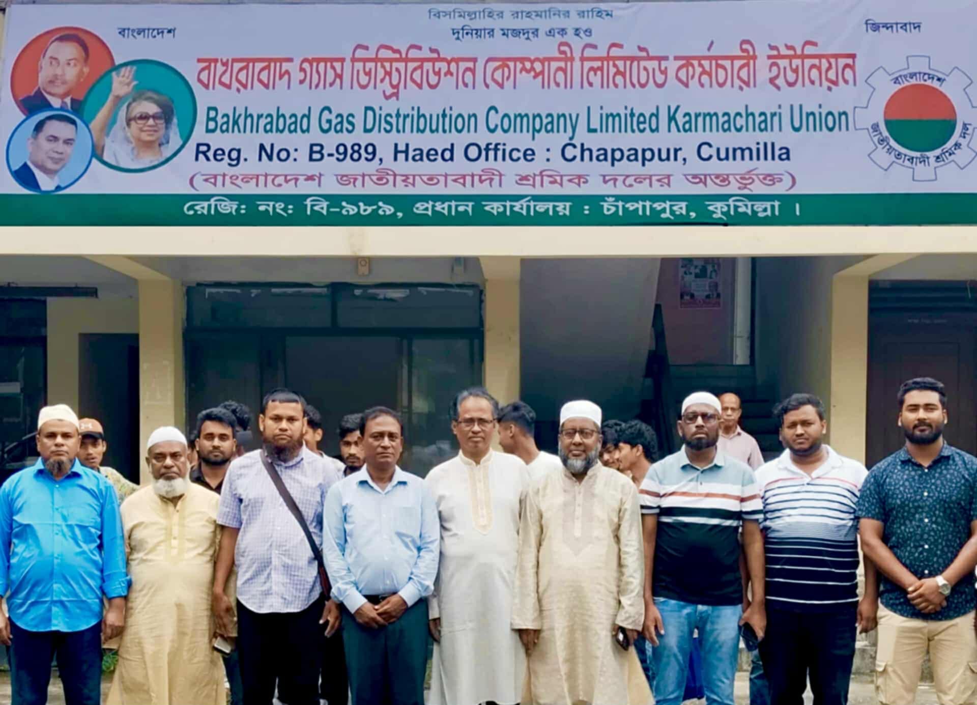 মোহাম্মদ শাহাদাত আলম অন্তর : বাখরাবাদ গ্যাস ডিস্ট্রবিউশন কোম্পানি লিমিটেড কর্মচারী ইউনিয়ন রেজিষ্ট্রেশন নং বি -৯৮৯ বাংলাদেশ জাতীয়তাবাদী শ্রমিক দল (ফেডারেশনের) অন্তভূক্ত হওয়ায় আজ ২০ আগষ্ট বুধবার বেলা ১২ টায় বাখরাবাদ গ্যাস ডিস্ট্রবিউশন কোম্পানি লিমিটেড কর্মচারী ইউনিয়ন রেজিষ্ট্রেশন নং - ৯৮৯ এর কার্যালয়ে বিপুল উৎসাহ উদ্দীপনার মধ্য দিয়ে জাতীয়তাবাদী শ্রমিক দলের সাইনবোর্ড উত্তোলন শেষে ইউনিয়ন কার্যালয়ে দোয়া মাহফিলের আয়োজন করা হয়। উক্ত দোয়া মুনাজাত পরিচালনা করেন বাখরাবাদ জামে মসজিদের ভারপ্রাপ্ত খতিব মাওলানা জাকির হোসেন। দোয়া মুনাজাতের পূর্বে সংক্ষিপ্ত আলোচনা সভা ইউনিয়নের সভাপতি বশির আহম্মেদ এর সভাপতিত্বে ও সাধারন সম্পাদক আব্দুল মালেক খন্দকার এর সঞ্চচালনায় অনুষ্ঠিত সভায় বক্তব্য রাখেন সংগঠনের সহ সভাপতি সাইফুল ইসলাম লিপন, সাবেক সহ সভাপতি আলমগীর শিকদার, যুগ্ন সম্পাদক এ এম শহীদুল বারী চৌধুরী, সহ সাধারণ সম্পাদক মো. মতিয়ার রহমান,সাংগঠনিক সম্পাদক এ জে এম মুরতুজা আলমসহ মোশাররফ হোসেন, স্বপন চন্দ্র দাশ,