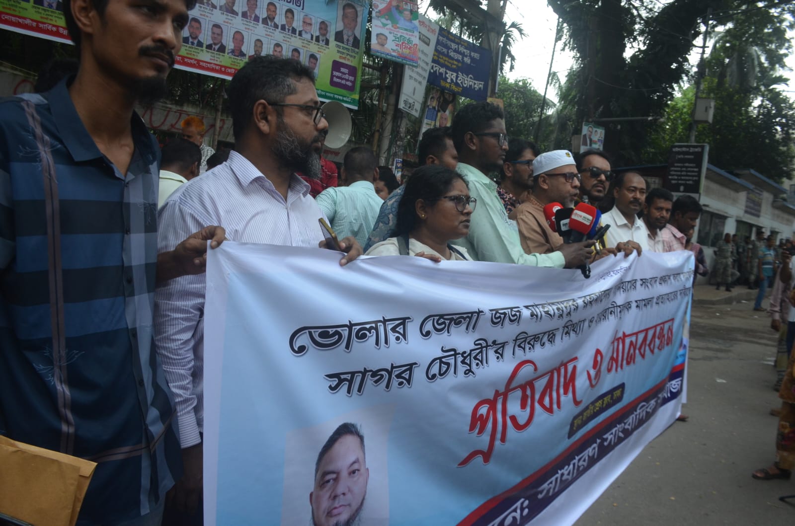 জেলা জজের দুর্নীতি আড়াল করতে সাংবাদিকের বিরুদ্ধে মিথ্যা মামলার প্রতিবাদে মানববন্ধন