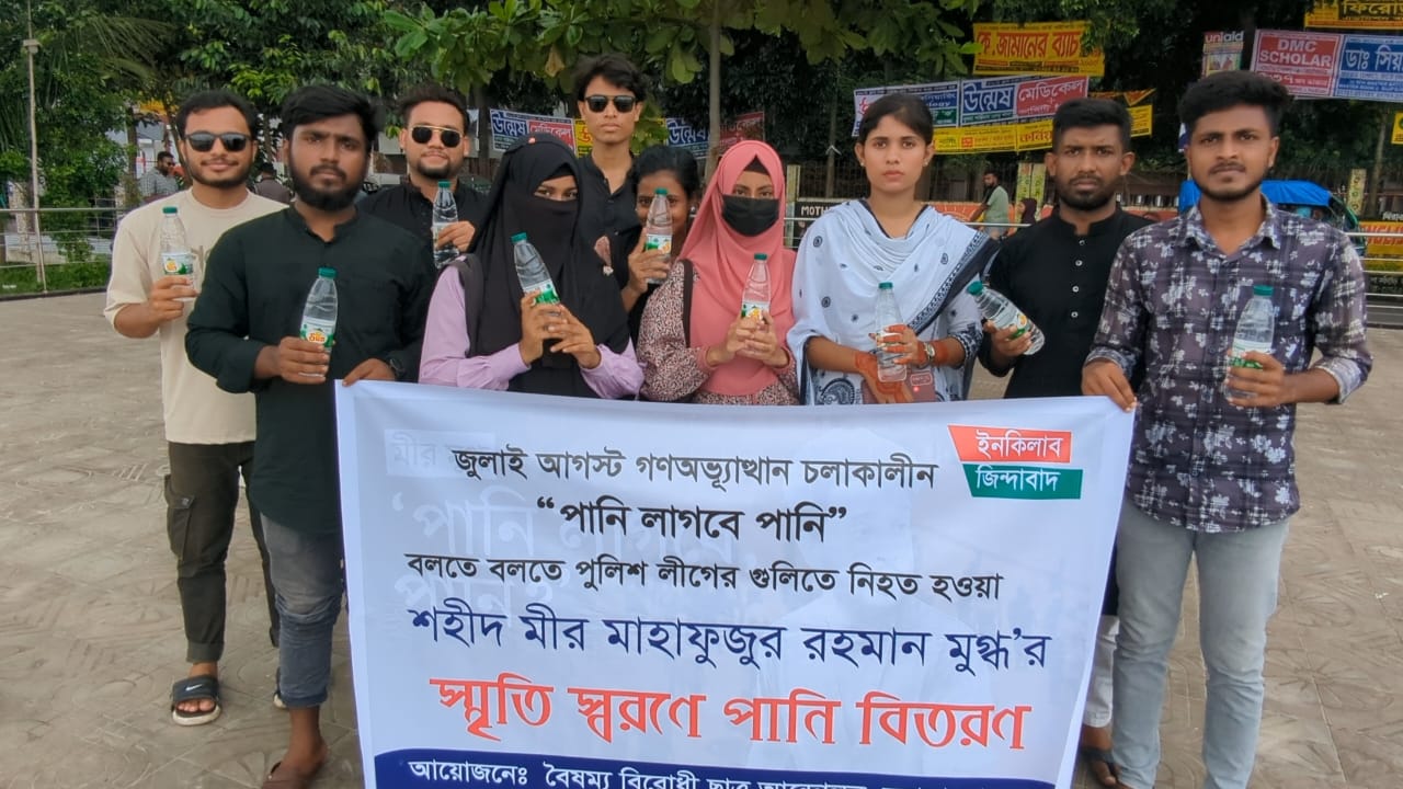 পানি বিতরণ অনুষ্ঠানের অন্যতম নেতা তামিম হাসান লিওন বলেন, বাংলাদেশের মানুষকে মুগ্ধর যে আত্মত্যাগ এটা সবার মধ্যে ছড়িয়ে দেয়ার চেষ্টা করব শহীদ মীর মুগ্ধ আমাদের ছেড়ে চলে গেছে তবে তার যে কাজ সে যে কাজটা আমাদেরকে দিয়েছে সে কাজটা দেশও বাসির সামনে তুলে ধরার চেষ্টা করছি।