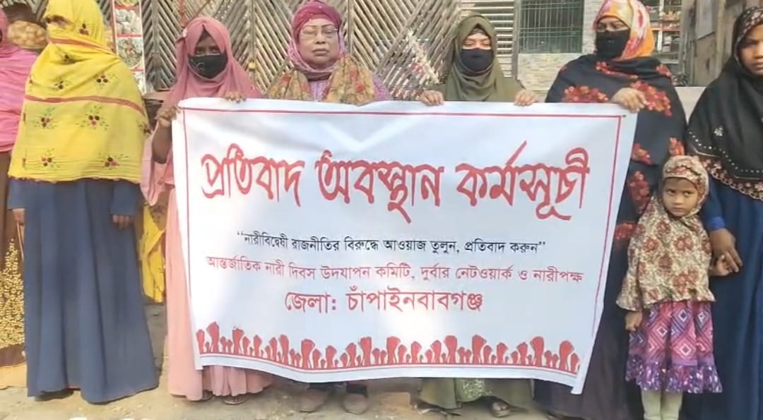মাহিদুল ইসলাম ফরহাদ, চাঁপাইনবাবগঞ্জ জেলা প্রতিনিধি : “নারীবিদ্বেষী রাজনীতির বিরুদ্ধে আওয়াজ তুলুন, প্রতিবাদ করুন, প্রতিরোধ গড়ুন”—এই স্লোগানকে সামনে রেখে চাঁপাইনবাবগঞ্জ জেলা প্রেসক্লাবের সামনে ৮ ফেব্রুয়ারি রবিবার প্রতিবাদ অবস্থান কর্মসূচি অনুষ্ঠিত হয়েছে। আন্তর্জাতিক নারী দিবস উদযাপন কমিটি, দূর্বার নেটওয়ার্ক ও নারী পক্ষ চাঁপাইনবাবগঞ্জ জেলা শাখার যৌথ আয়োজনে অনুষ্ঠিত এই কর্মসূচিতে শতাধিক নারী অংশগ্রহণ করেন। অবস্থান কর্মসূচিতে অংশগ্রহণকারীরা নারীবিদ্বেষী রাজনীতির বিরুদ্ধে বিভিন্ন স্লোগান দেন এবং প্রতিবাদ জানান। কর্মসূচিতে প্রধান বক্তা হিসেবে বক্তব্য রাখেন চাঁপাইনবাবগঞ্জ, রাজশাহী, নাটোর ও নওগাঁ—এই চারটি জেলার দায়িত্বপ্রাপ্ত সভানেত্রী মোসাঃ আকসানা খাতুন। তিনি বলেন, “নারীর মর্যাদা ও অধিকার ক্ষুণ্ন করে এমন রাজনৈতিক বক্তব্য ও কর্মকাণ্ড কোনোভাবেই গ্রহণযোগ্য নয়।