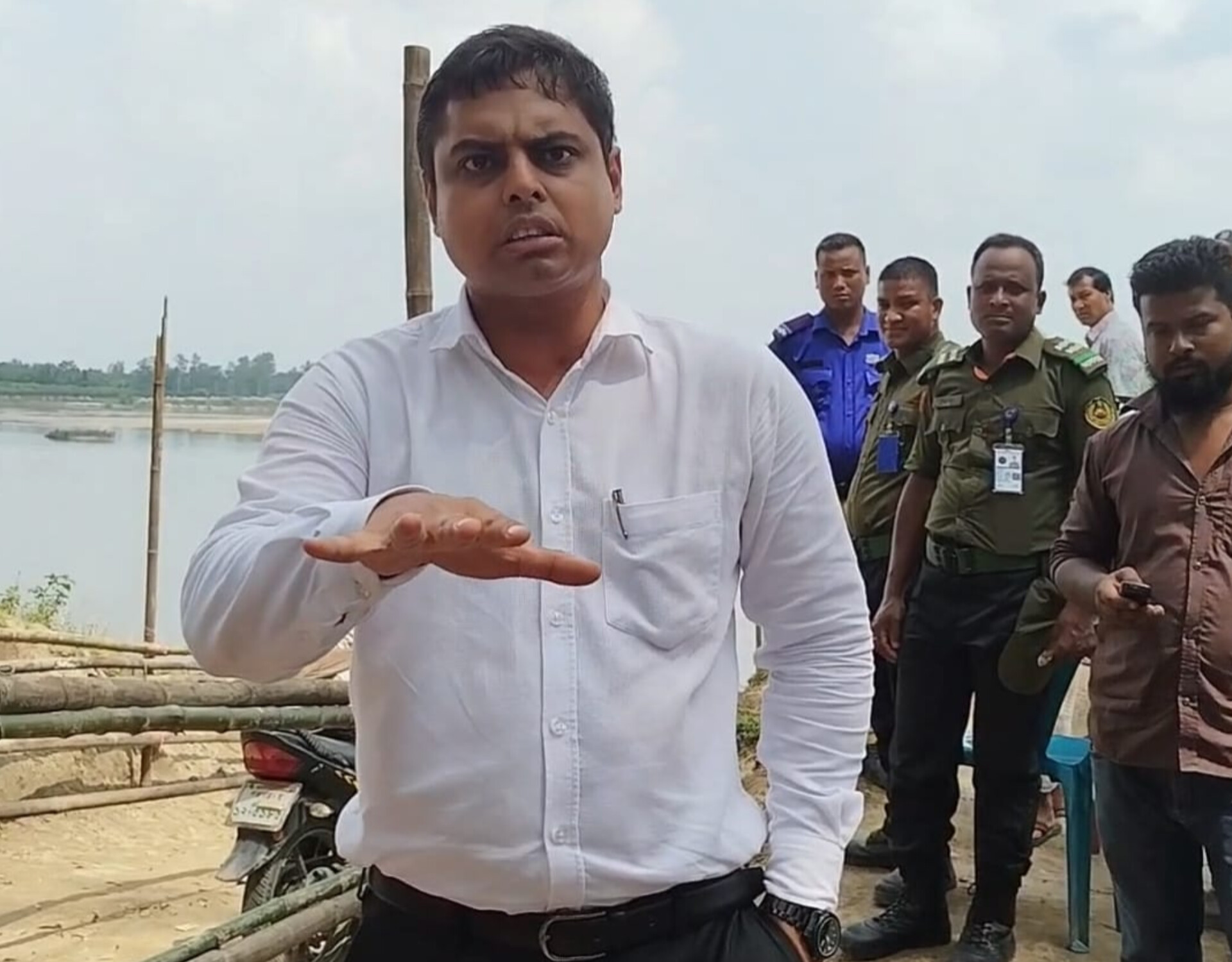 এসময় করতোয়া নদীর ঘাটে কর্তব্যরত ম্যাজিস্ট্রেট মো. তাহমিদুর রহমান সাংবাদিকদের নদী পার হতে বাঁধা দেন। সেই সময়ে নদীতে তিন থেকে চারটি নৌকা চলাচল করছিল এবং নৌকায় মোটরসাইকেল নিয়ে পারাপার হচ্ছিল মানুষজন। কিন্তু সাংবাদিকরা নৌকায় উঠতে চাইলে তিনি বাঁধা দিয়ে বলেন মোটরসাইকেল নেওয়া যাবে না। সাংবাদিকরা প্রশ্ন তোলেন—“যখন অন্যরা মোটরসাইকেল পার হচ্ছে, আমরা কেন নিউজের কাজে যেতে পারব না?” এতে তিনি ক্ষুব্ধ হয়ে সাংবাদিকদের উদ্দেশে বলেন, “আপনি আল জাজিরা, বিবিসি বাংলা আর আর্ন্তজাতিক সাংবাদিক হন আর যেই সাংবাদিক হন, তাতে আমার যায় আসে না। যেতে পারবেন না।” তাঁর এমন আচরণের সাংবাদিকরা ক্যামরায় রেকর্ড করলেই কিছুক্ষণ পরেই তিনি সাংবাদিকদের উদ্দেশে আরও অশালীনভাবে বলেন, “আপনারা সন্ত্রাসী।” শতাধিক লোকের সামনে সাংবাদিকদের এভাবে অপমানিত করার ঘটনায় স্থানীয় গণমাধ্যমকর্মীদের মধ্যে তীব্র ক্ষো ভ দেখা দিয়েছে।