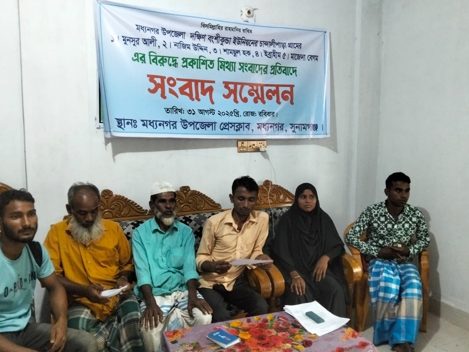 আজ রববার ৩১ আগষ্ট দুপুরে মধ্যনগর প্রেসক্লাবের অস্থায়ী কার্যালয়ে গ্রামের কয়েকজন ভুক্তভোগী গ্রামবাসী এ সংবাদ সম্মেলন করেন। সংবাদ সম্মেলনে লিখিত বক্তব্য পাঠ করেন মুনছুর আলী। এসময় ভুক্তভোগীদের মধ্যে উপস্থিত ছিলেন নাজিম উদ্দিন (৬৫), শামছুল হক, ইব্রাহিম মিয়া ও মাজেদা বেগম।