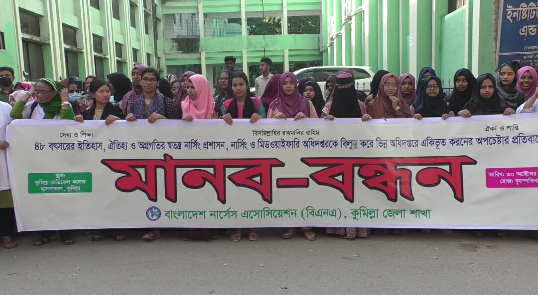 বৃহস্পতিবার সকালে কুমিল্লা মেডিকেল কলেজ হাসপাতাল প্রাঙ্গণে এই মানববন্ধনের আয়োজন করে বাংলাদেশ নার্সেস এসোসিয়েশন (বিএনএ), কুমিল্লা জেলা শাখা।