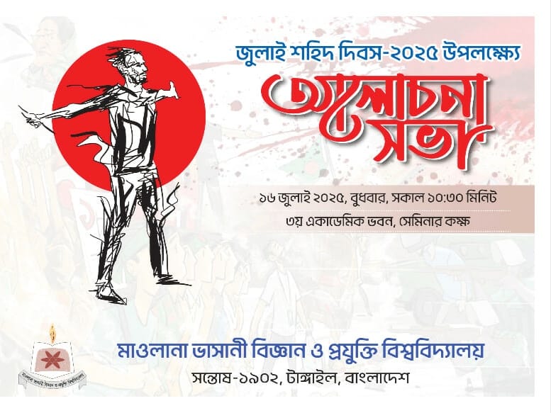 মোঃ এরশাদ, টাংগাইল প্রতিনিধি : মাওলানা ভাসানী বিজ্ঞান ও প্রযুক্তি বিশ্ববিদ্যালয়ে (মাভাবিপ্রবি) "জুলাই শহিদ দিবস" উপলক্ষে আগামী ১৬ জুলাই ২০২৫, বুধবার সকাল সাড়ে ১০টায় এক আলোচনা সভার আয়োজন করা হয়েছে। বিশ্ববিদ্যালয়ের তৃতীয় একাডেমিক ভবনের সেমিনার কক্ষে এই অনুষ্ঠান অনুষ্ঠিত হবে।