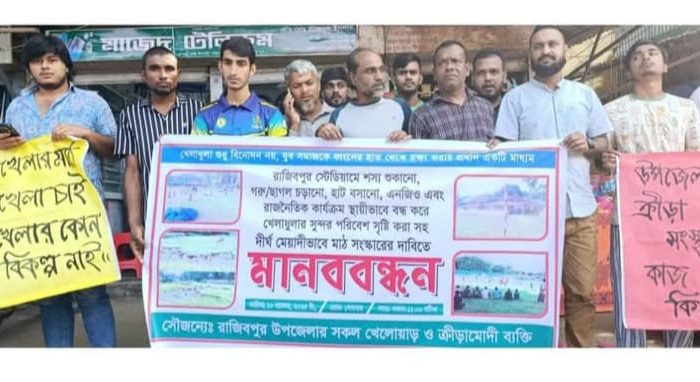 আতাউররহমান, রাজিবপুর, কুড়িগ্রাম প্রতিনিধি : রাজিবপুরে খেলার মাঠ সংস্কারের দাবিতে সোমবার সকাল ১১ টাডয় উপজেলার রাজিবপুর বাজারের সুপার মার্কেটের সামনে এ মানববন্ধন অনুষ্ঠিত হয়। রাজিবপুর মিনি স্টেডিয়াম মাঠটি বর্তমানে খেলাধুলার