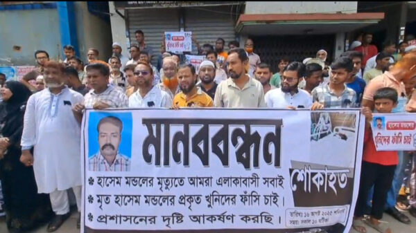 সাভার প্রতিনিধি : সাভারে হাশেম মন্ডল নামের এক ব্যক্তিকে গলা কেটে হত্যার ঘটনায় আসামিদের দ্রুত গ্রেফতারের দাবিতে বিক্ষোভ মিছিল ও মানববন্ধন করেছে এলাকাবাসী। শনিবার সকালে সাভারের বিরুলিয়া সড়ক অবরোধ করে