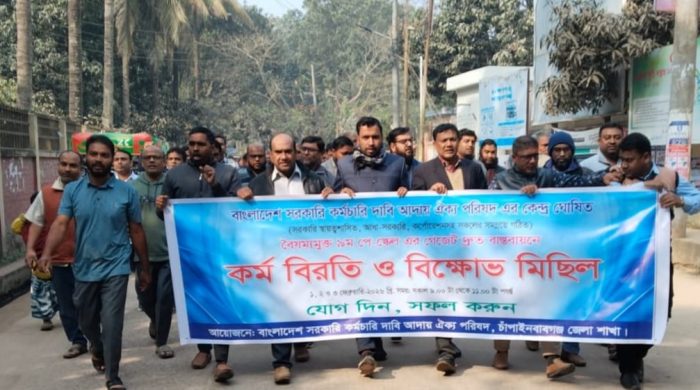 মাহিদুল ইসলাম ফরহাদ, চাঁপাইনবাবগঞ্জ জেলা প্রতিনিধি : জাতীয় বেতন কমিশনের সুপারিশকৃত বৈষম্যহীন এক দফা দাবি অনুযায়ী ৯ম পে-স্কেলের গেজেট জারির দাবিতে চাঁপাইনবাবগঞ্জে অবস্থান ও বিক্ষোভ কর্মসূচি পালন করেছে বাংলাদেশ সরকারি