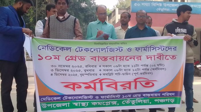 খাদেমুল ইসলাম, পঞ্চগড় জেলা প্রতিনিধি : দশম গ্রেড বাস্তবায়নের দাবিতে তেতুলিয়া মেডিকেল ইনস্টিটিউট হাসপাতালে ২ ঘণ্টা কর্মবিরতি পালন করেছে মেডিকেল টেকনোলজিস্ট ও ফার্মাসিস্টরা। রবিবার ৩০ নভেম্বর তেঁতুলিয়া উপজেলা হাসপাতালের সামনে সকাল
