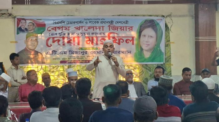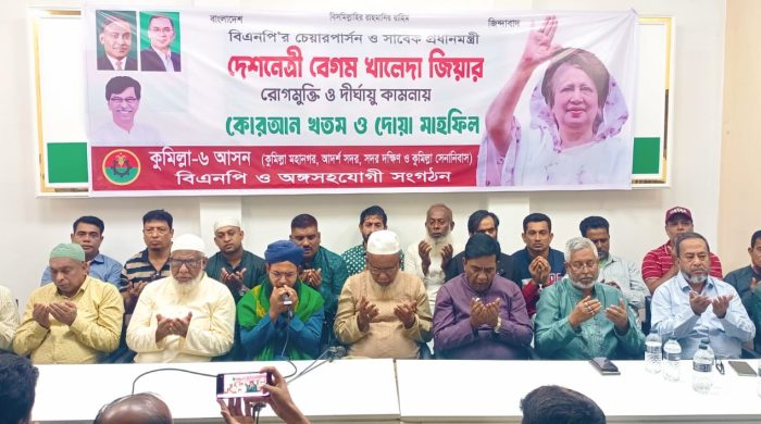কুমিল্লা প্রতিনিধি : কুমিল্লায় সাবেক প্রধানমন্ত্রী ও বিএনপির চেয়ারপার্সন দেশনেত্রী বেগম খালেদা জিয়ার দ্রুত আরোগ্য ও রোগমুক্তি কামনায় কোরআন খতম ও দোয়া মাহফিল অনুষ্ঠিত হয়েছে। বাংলাদেশ জাতীয়তাবাদী দল বিএনপি’র চেয়ারপার্সনের