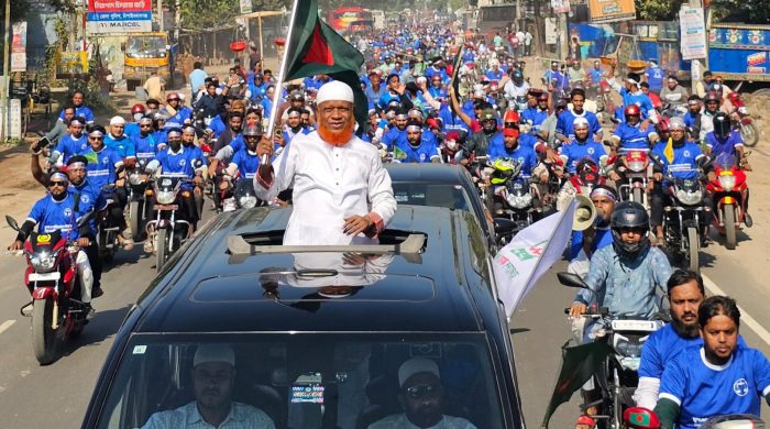 মাহিদুল ইসলাম ফরহাদ, চাঁপাইনবাবগঞ্জ জেলা প্রতিনিধি : চাঁপাইনবাবগঞ্জ-৩ আসনে দাঁড়িপাল্লায় ভোট চেয়ে মোটরসাইকেল শোভাযাত্রা করেছে বাংলাদেশ জামায়াত ইসলামীর নেতাকর্মীরা। শনিবার নবাবগঞ্জ সরকারি কলেজ প্রাঙ্গণে সকাল ৯টা থেকে বিপুল সংখ্যক মোটরসাইকেল