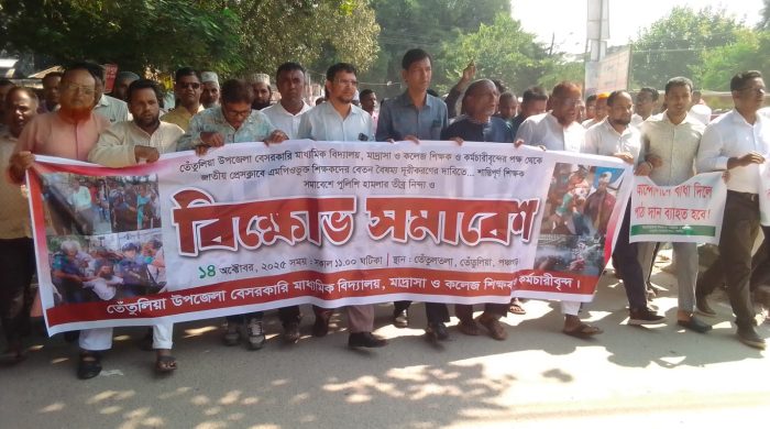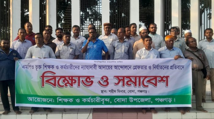 বোদা, পঞ্চগড় : এমপিও ভুক্ত শিক্ষক ও কর্মচারীদের ন্যায্য দাবী আদায়ের আন্দোলনে ঢাকায় শিক্ষকদের গ্রেফতার ও নির্যাতনের প্রতিবাদে বোদা উপজেলার শিক্ষক ও কর্মচারীবৃন্দের ব্যানারে বিক্ষোভ সমাবেশ অনুষ্ঠিত হয়েছে। সোমবার ১৩