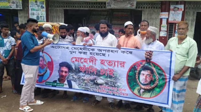 কুমিল্লা প্রতিনিধি : মুরাদনগরে অটোরিকশা চালক মেহেদী হাসান হত্যার খুনিদের ফাঁসী দাবিতে মানববন্ধন ও বিক্ষোভ মিছিল করেছে এলাকাবাসী। আজ বৃহস্পতিবার ২ অক্টোবর দুপুরের কুমিল্লার মুরাদনগর উপজেলা বাঙ্গরা বাজার জেলা পরিষদ