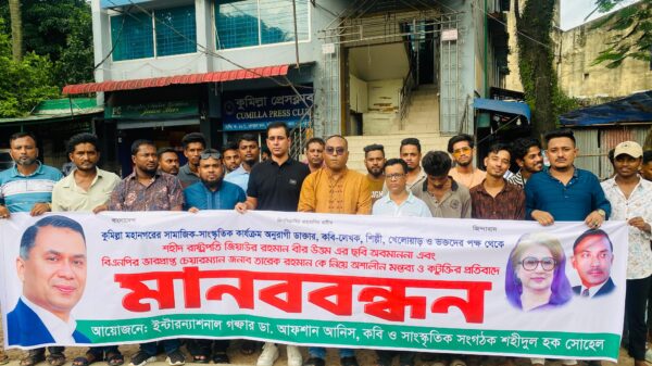 কুমিল্লা প্রতিনিধি : জিয়াউর রহমানের ছবি অবমাননা ও বিএনপির ভারপ্রাপ্ত চেয়ারম্যান তারেক রহমানকে নিয়ে অশালীন মন্তব্য ও কটুক্তির প্রতিবাদে কুমিল্লা প্রেস ক্লাবের সামনে মানববন্ধন ও বিক্ষোভ মিছিল করেছেন সাংস্কৃতিক কর্মী ও